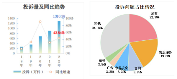 2022年,全國(guó)市場(chǎng)監(jiān)管部門受理消費(fèi)者投訴1310.38萬(wàn)件,同比增長(zhǎng)43.84%,增速較2021年有所放大。從投訴問(wèn)題看,質(zhì)量298.70萬(wàn)件、售后服務(wù)248.96萬(wàn)件、合同115.91萬(wàn)件、食品安全109.06萬(wàn)件,合計(jì)占投訴的58.96%。其中,售后服務(wù)問(wèn)題增長(zhǎng)最快,群眾反映最強(qiáng)烈,同比增長(zhǎng)57.67%。