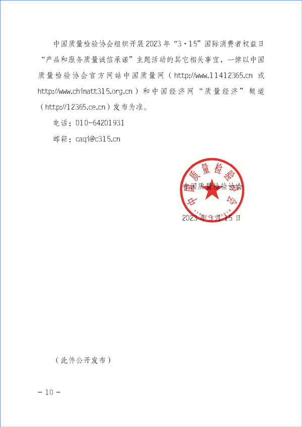 中國(guó)質(zhì)量檢驗(yàn)協(xié)會(huì)組織開(kāi)展2023年“3·15”國(guó)際消費(fèi)者權(quán)益日“產(chǎn)品和服務(wù)質(zhì)量誠(chéng)信承諾”主題活動(dòng)的其它相關(guān)事宜,一律以中國(guó)質(zhì)量檢驗(yàn)協(xié)會(huì)官方網(wǎng)站中國(guó)質(zhì)量網(wǎng)(http://www.11412365.cn或http://www.chinatt315.org.cn)和中國(guó)經(jīng)濟(jì)網(wǎng)“質(zhì)量經(jīng)濟(jì)”頻道(http://12365.ce.cn)發(fā)布為準(zhǔn)。