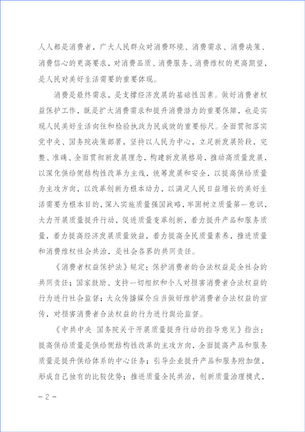 消費(fèi)是最終需求,是支撐經(jīng)濟(jì)發(fā)展的基礎(chǔ)性因素。做好消費(fèi)者權(quán)益保護(hù)工作,既是擴(kuò)大消費(fèi)需求和提升消費(fèi)潛力的重要保障,也是實(shí)現(xiàn)人民美好生活向往和檢驗(yàn)執(zhí)政為民成效的重要標(biāo)尺。全面貫徹落實(shí)黨中央、國(guó)務(wù)院決策部署,堅(jiān)持以人民為中心,立足新發(fā)展階段,完整、準(zhǔn)確、全面貫徹新發(fā)展理念,構(gòu)建新發(fā)展格局,推動(dòng)高質(zhì)量發(fā)展,以深化供給側(cè)結(jié)構(gòu)性改革為主線(xiàn),統(tǒng)籌發(fā)展和安全,以提高供給質(zhì)量為主攻方向,以改革創(chuàng)新為根本動(dòng)力,以滿(mǎn)足人民日益增長(zhǎng)的美好生活需要為根本目的,深入實(shí)施質(zhì)量強(qiáng)國(guó)戰(zhàn)略,牢固樹(shù)立質(zhì)量第一意識(shí),大力開(kāi)展質(zhì)量提升行動(dòng),促進(jìn)質(zhì)量變革創(chuàng)新,著力提升產(chǎn)品和服務(wù)質(zhì)量,著力提高經(jīng)濟(jì)發(fā)展質(zhì)量效益,著力提高全民質(zhì)量素養(yǎng),推進(jìn)質(zhì)量和消費(fèi)維權(quán)社會(huì)共治,是社會(huì)各界的共同責(zé)任。