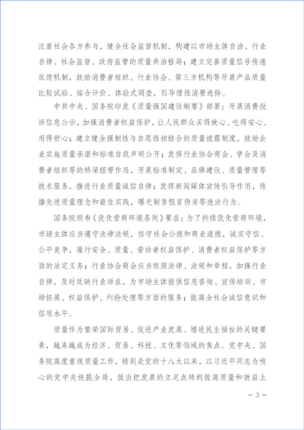 經(jīng)濟(jì)社會(huì)發(fā)展的動(dòng)力,源于市場(chǎng)主體的活力和社會(huì)創(chuàng)造力。本協(xié)會(huì)作為具有獨(dú)立法人資質(zhì)的社團(tuán)組織,在2023年“3·15”國(guó)際消費(fèi)者權(quán)益日“產(chǎn)品和服務(wù)質(zhì)量誠(chéng)信承諾”主題活動(dòng)中,充分發(fā)揮質(zhì)量檢驗(yàn)行業(yè)組織的職能職責(zé)優(yōu)勢(shì)和社團(tuán)中介機(jī)構(gòu)的橋梁紐帶作用,嚴(yán)格遵守相關(guān)法律法規(guī)和有關(guān)規(guī)定,堅(jiān)持以“切實(shí)為企業(yè)提供自愿參與的相關(guān)服務(wù)工作,不亂收費(fèi)、不增加企業(yè)負(fù)擔(dān),不干擾公平競(jìng)爭(zhēng),不干擾營(yíng)商環(huán)境,不干擾市場(chǎng)秩序,不干擾企業(yè)、企業(yè)相關(guān)負(fù)責(zé)人的正常生產(chǎn)生活,也不涉嫌評(píng)比或評(píng)價(jià)、排序,更不借活動(dòng)名義向企業(yè)攤派收費(fèi)、搭車(chē)收費(fèi)”為原則,充分發(fā)揮企業(yè)維護(hù)消費(fèi)者合法權(quán)益的市場(chǎng)主體作用,廣泛動(dòng)員廣大企業(yè)自愿參加本次活動(dòng),及時(shí)準(zhǔn)確地為廣大企業(yè)做好服務(wù)工作,全力為廣大企業(yè)提供力所能及的免費(fèi)增值服務(wù)而切實(shí)減輕企業(yè)負(fù)擔(dān),充分激發(fā)市場(chǎng)主體的活力和創(chuàng)造力,大力發(fā)揮新聞媒體的正面引導(dǎo)和輿論監(jiān)督作用,下最大氣力抓好質(zhì)量提升,大力推進(jìn)質(zhì)量社會(huì)共治,著力促進(jìn)消費(fèi)維權(quán)社會(huì)共治,引導(dǎo)動(dòng)員全社會(huì)切實(shí)維護(hù)消費(fèi)者合法權(quán)益,促進(jìn)消費(fèi)升級(jí),改善消費(fèi)體驗(yàn),全力營(yíng)造質(zhì)量誠(chéng)信社會(huì)共治的氛圍,提振消費(fèi)信心,不斷滿(mǎn)足人民群眾對(duì)美好生活的更高要求,持續(xù)為我國(guó)經(jīng)濟(jì)構(gòu)建新發(fā)展格局和高質(zhì)量發(fā)展與質(zhì)量強(qiáng)國(guó)建設(shè)作出積極貢獻(xiàn)。
