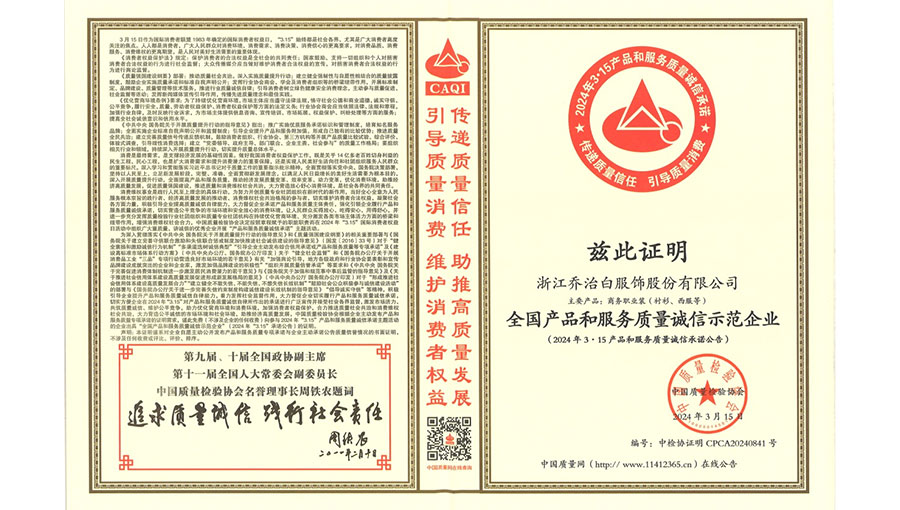 喬治白先后榮獲中國名牌產(chǎn)品、質(zhì)量卓越企業(yè)、中國職業(yè)裝十大領(lǐng)軍企業(yè)、全國守合同重信用單位、國家級綠色工廠、國家高新技術(shù)企業(yè)、浙江省企業(yè)研究院、浙江省企業(yè)技術(shù)中心、浙江省商標(biāo)品牌示范企業(yè)等榮譽(yù)稱號。作為全國標(biāo)準(zhǔn)化工作先進(jìn)單位,喬治白先后參與《職業(yè)裝檢驗(yàn)規(guī)則》、《襯衫》、《女西服、大衣》、《單服、套裝規(guī)格》《西褲》《服裝定制通用技術(shù)規(guī)范》《針織運(yùn)動服》等12項(xiàng)國家標(biāo)準(zhǔn)的起草與修訂工作,《全毛襯西服》行業(yè)標(biāo)準(zhǔn)起草,“浙江制造”團(tuán)體標(biāo)準(zhǔn)《制式校服》、《針織學(xué)生運(yùn)動服》起草制定等工作。