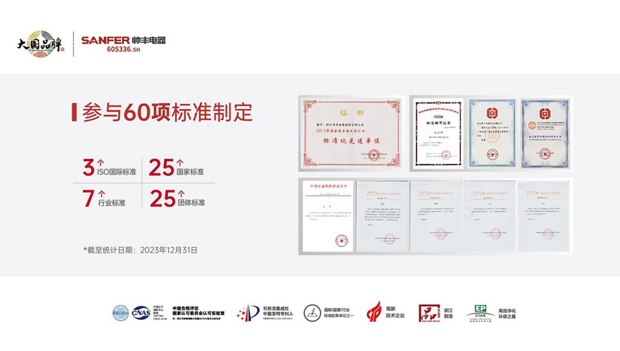 帥豐電器堅持以品質為導向,擁有行業(yè)首個“中國合格評定國家認可委員會認可實驗室”,包含燃氣、電氣、噪聲、氣味降低度、油脂分離度、環(huán)境、包裝等多個行業(yè)一流的試驗室,可開展上百項集成灶指標檢測,為產(chǎn)品品質和新品研發(fā)提供了有力保障。代表行業(yè)參與60個標準制定,包括3個ISO國際標準、25個國家標準、7個行業(yè)標準、25個團體標準,為推動行業(yè)發(fā)展做出了重要貢獻。