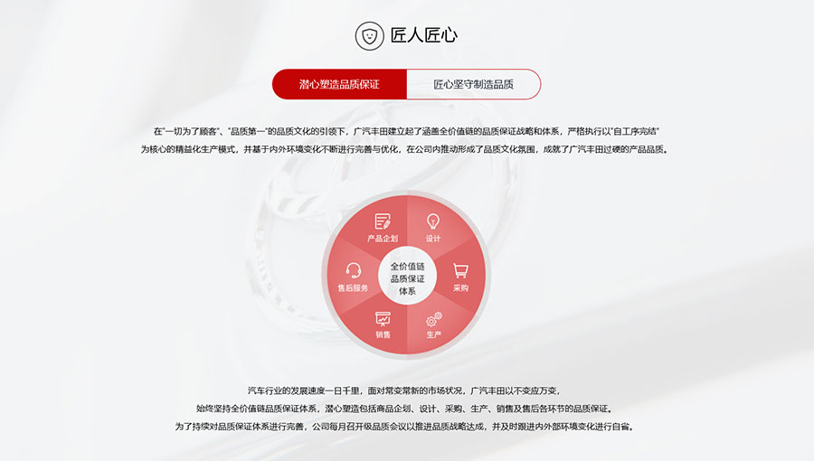 全球品質(zhì),打造“零不良”模范工廠:廣汽豐田秉承豐田數(shù)十年汽車制造之精義,引進(jìn)了全球最先進(jìn)的生產(chǎn)設(shè)備和工藝,布局了沖壓、焊裝、成型、涂裝和總裝等五大生產(chǎn)工藝,取得豐田全球品質(zhì)監(jiān)查雙線“零不良”,著力打造“豐田全球模范工廠”。