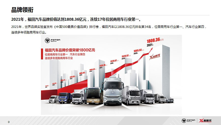 北汽福田汽車股份有限公司(簡稱福田汽車)成立于1996年,1998年在上海證券交易所上市,是中國品種最全、規(guī)模最大的商用車企業(yè)之一,2021年品牌價(jià)值達(dá)1808.36億元,連續(xù)16年蟬聯(lián)中國商用車行業(yè)第一位。2021年,在福田汽車成立的第25周年,總銷量突破1000萬輛,成為中國汽車工業(yè)史上首個(gè)銷量突破千萬輛的商用車企、中國首個(gè)千萬級“雙自主”商用車企、全球突破千萬銷量用時(shí)最短的商用車企。海外累計(jì)出口65萬輛,連續(xù)10年位居中國商用車出口第一,產(chǎn)品覆蓋全球110個(gè)國家和地區(qū)。