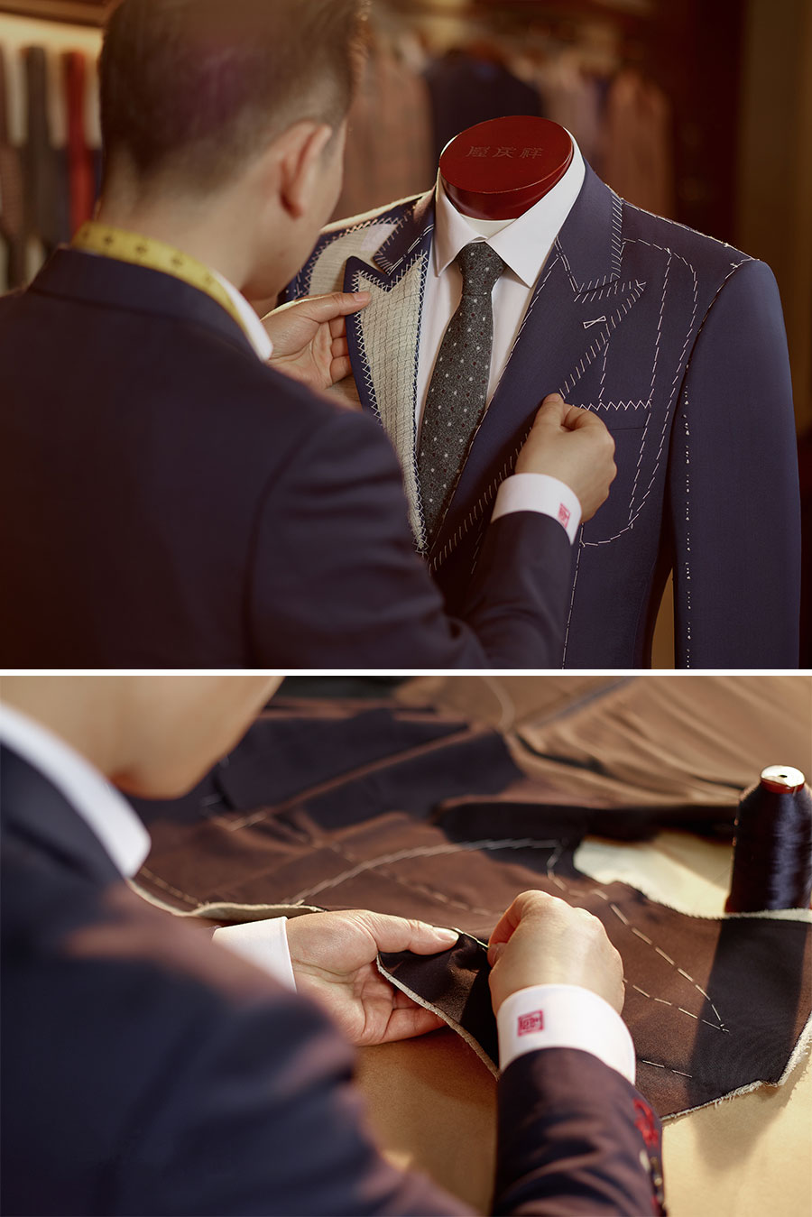 隆慶祥以量身定制為核心特色,提供從面料選擇、款式設(shè)計(jì)到工藝優(yōu)化、售后服務(wù)的全程服務(wù),產(chǎn)品均為“單人單版、單版單裁、單裁單做”,以獨(dú)一無(wú)二的專屬性彰顯尊貴榮耀。每套西裝定面料、定款式、制版、裁剪、制作、試樣、后道整理、取件共八道工序,均采用406道工序,而且大量工序是手工制作。產(chǎn)品均“單人單版、單版單裁、單裁單做”,以獨(dú)一無(wú)二的專屬性彰顯尊貴榮耀。