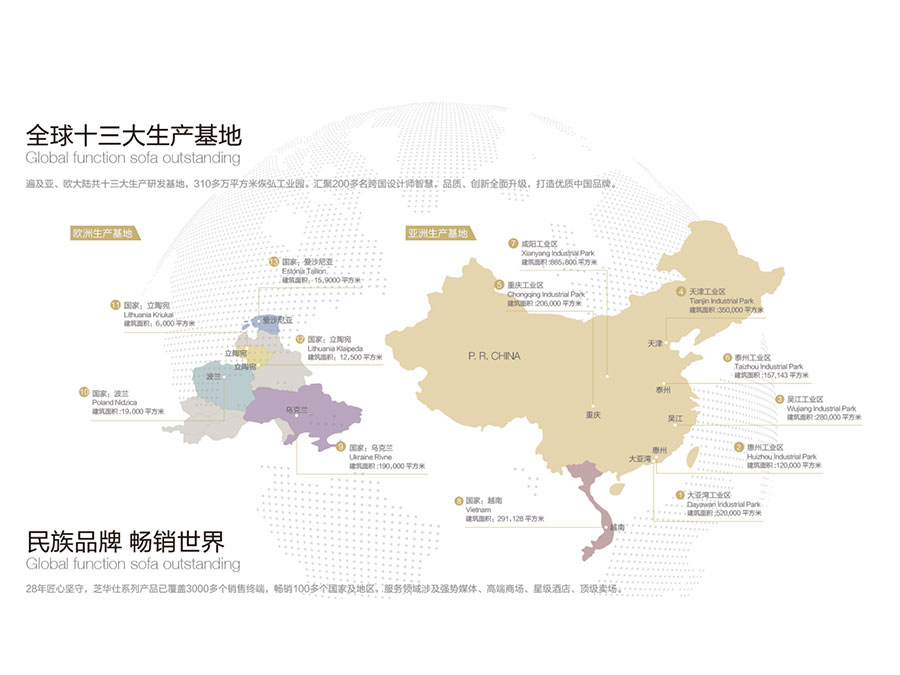 在全球設(shè)有多家子公司、分公司及關(guān)聯(lián)公司,運(yùn)營網(wǎng)絡(luò)橫跨亞、美、歐、澳四大洲,擁有超過8000個(gè)銷售終端,產(chǎn)品暢銷中國、美國、英國、加拿大等100多個(gè)國家及地區(qū),旗下“CHEERS”、“芝華仕”和“頭等艙”品牌專賣店超過8000家,形成了體系完備的全球跨國發(fā)展大格局,已成為集研發(fā)、制造、銷售和服務(wù)于一體的國際化智能家居企業(yè)。