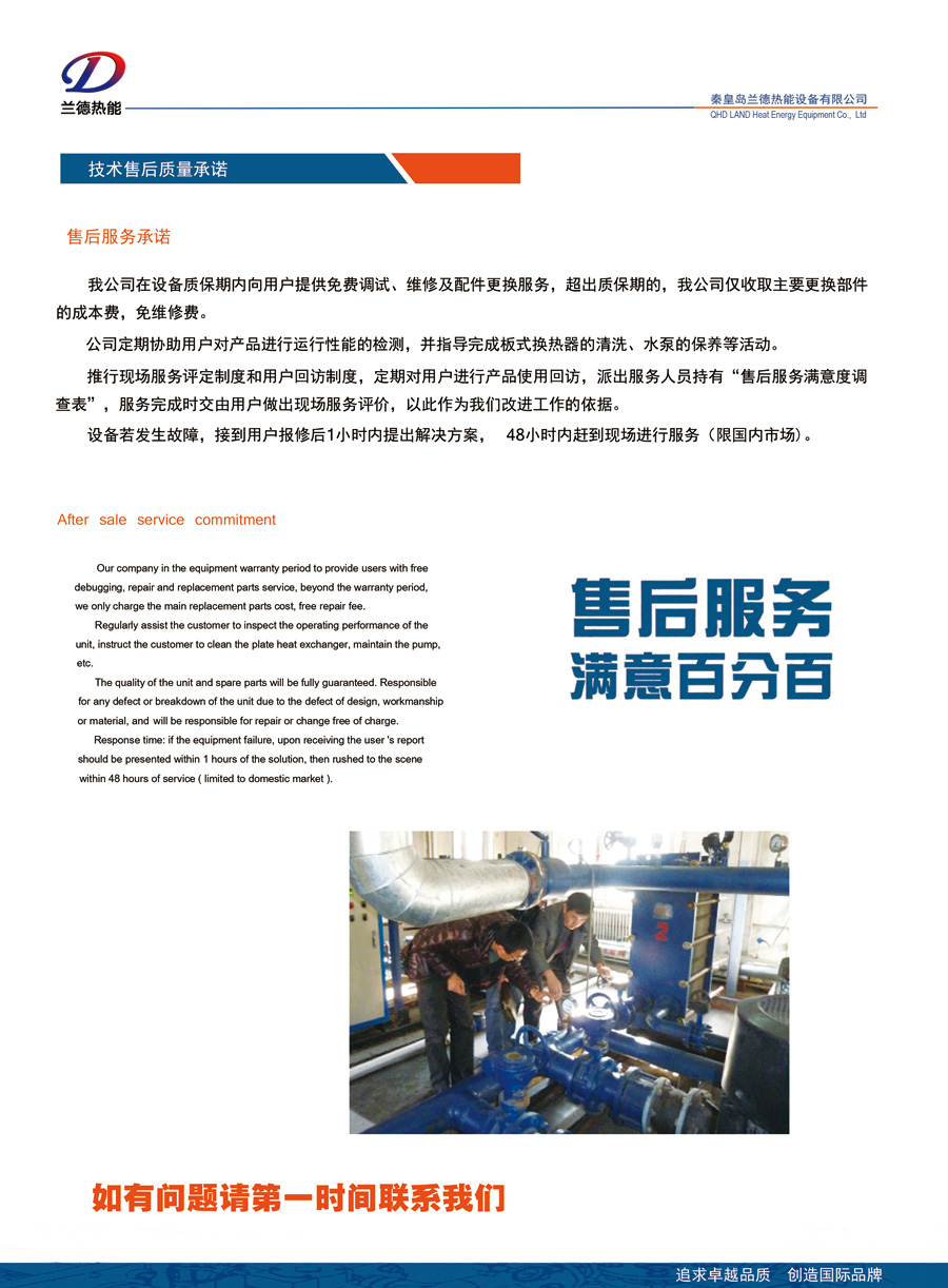 公司秉承“追求卓越品質(zhì),創(chuàng)造國(guó)際品牌”的經(jīng)營(yíng)理念,隨時(shí)為客戶提供全球領(lǐng)先的換熱解決方案,專業(yè)提供高品質(zhì)的換熱設(shè)備和快速、高效的服務(wù),并贏得了行業(yè)領(lǐng)域多家客戶的信賴。許多國(guó)家重點(diǎn)工程項(xiàng)目及全國(guó)各大熱力公司都使用了我公司的產(chǎn)品,如大同熱力公司、包頭熱力公司、蘭州熱力公司、西山煤電熱力公司、釣魚臺(tái)國(guó)賓館、北京國(guó)資委、國(guó)家大劇院、大眾汽車、長(zhǎng)慶油田等。蘭德熱能將竭誠(chéng)為您提供優(yōu)質(zhì)的產(chǎn)品和最好的服務(wù)!