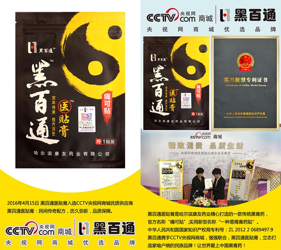 黑百通醫(yī)貼膏,每貼使用6-7天,持續(xù)使用168+小時。黑百通攜手CCTV央視網(wǎng)商城,強強聯(lián)合,立志打造家喻戶曉的民族品牌,讓世界愛上中國的黑膏藥!
