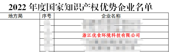 近日,國家知識產(chǎn)權(quán)局發(fā)布了《關于確定2022年新一批及通過復核的國家知識產(chǎn)權(quán)示范企業(yè)和優(yōu)勢企業(yè)的通知》通知,浙江優(yōu)食環(huán)境科技有限公司榮獲“2022年度國家知識產(chǎn)權(quán)優(yōu)勢企業(yè)”的稱號。