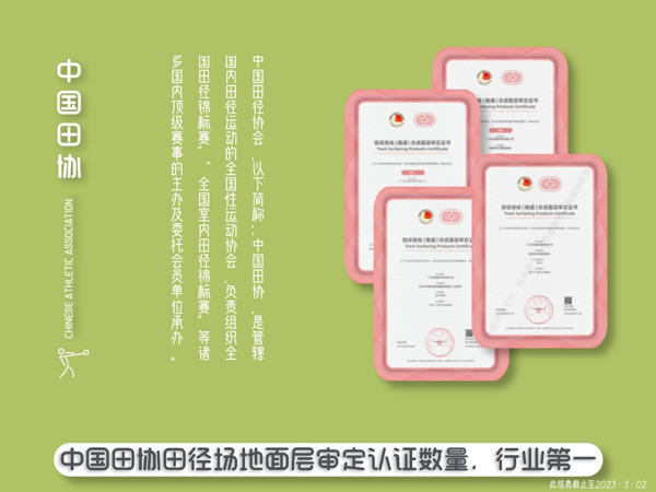 中國田徑協(xié)會田徑場地(跑道)合成面層產(chǎn)品審定辦法,是為規(guī)范田徑場地合成面層產(chǎn)品使用,提高面層材料產(chǎn)品質(zhì)量、促進田徑場地建設(shè)質(zhì)量,滿足舉辦高水平田徑競賽及開展群眾性、學校內(nèi)田徑運動的需要,中國田徑協(xié)會(以下簡稱:中國田協(xié))參照世界田徑聯(lián)合會(以下簡稱:世界田聯(lián))認證體系,結(jié)合中國田徑場地發(fā)展現(xiàn)狀制定的。是國內(nèi)最具知名度和可靠性的行業(yè)評級體系之一,是各大運動地材企業(yè)的“兵家必爭之地”。