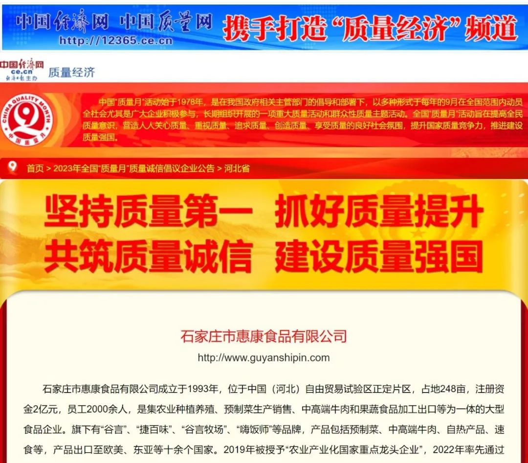 近日,石家莊市惠康食品有限公司再傳捷報,在中國質(zhì)量檢驗協(xié)會組織開展的2023年全國“質(zhì)量月”專題活動中,深耕食品制造行業(yè)30年的惠康食品,憑借過硬的產(chǎn)品質(zhì)量再次被授予“全國質(zhì)量誠信標(biāo)桿企業(yè)”?!吨袊|(zhì)量網(wǎng)》、《中國經(jīng)濟網(wǎng)》、《中國產(chǎn)品質(zhì)量信譽網(wǎng)》等媒體予以集中展示宣傳。這是中國質(zhì)量檢驗協(xié)會、社會各界及消費者對惠康食品產(chǎn)品與服務(wù)質(zhì)量的高度認可。