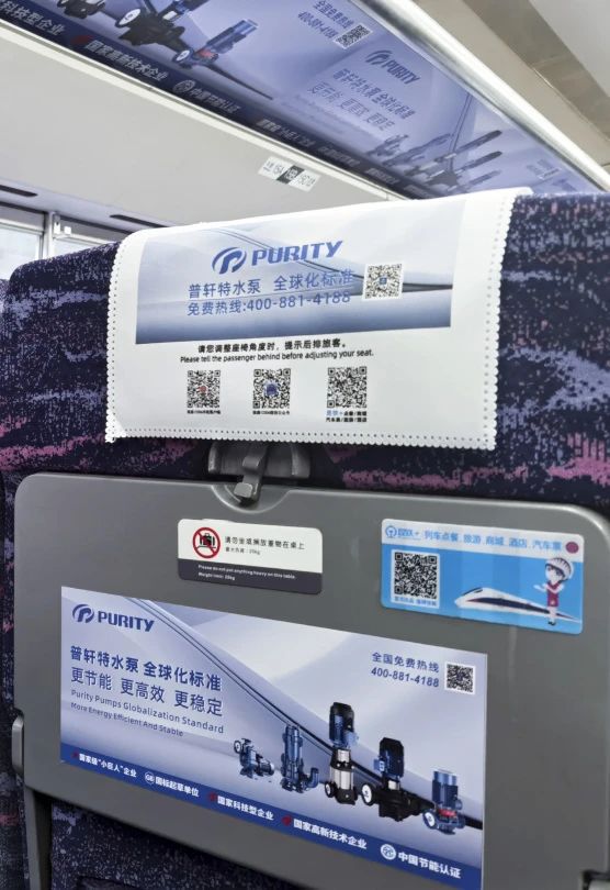 “普軒特號”高鐵專列以“普軒特水泵,全球化標(biāo)準(zhǔn)”為主旨,在車廂內(nèi)以全面覆蓋的宣傳形式,將專列打造成展示普軒特形象的“移動(dòng)展廳”,深度刻畫普軒特對全球標(biāo)準(zhǔn)的堅(jiān)定態(tài)度