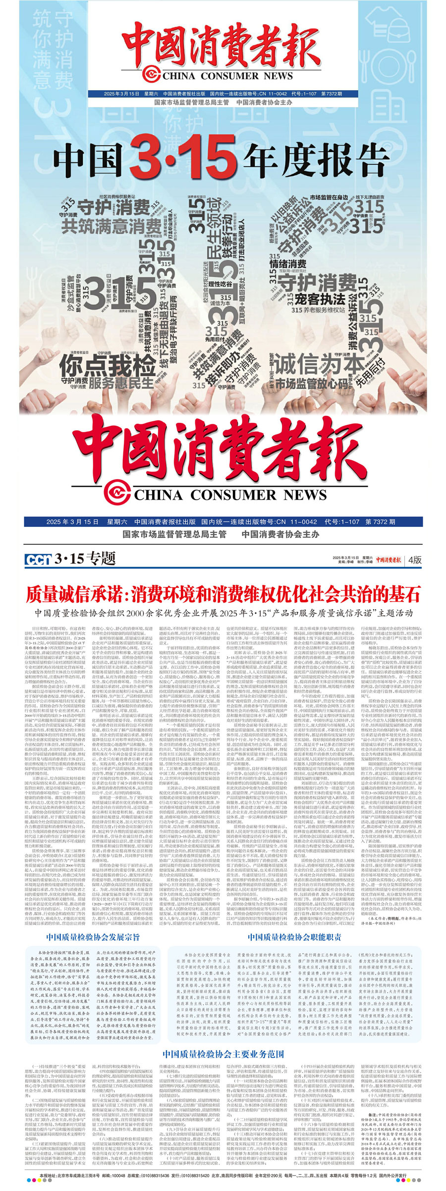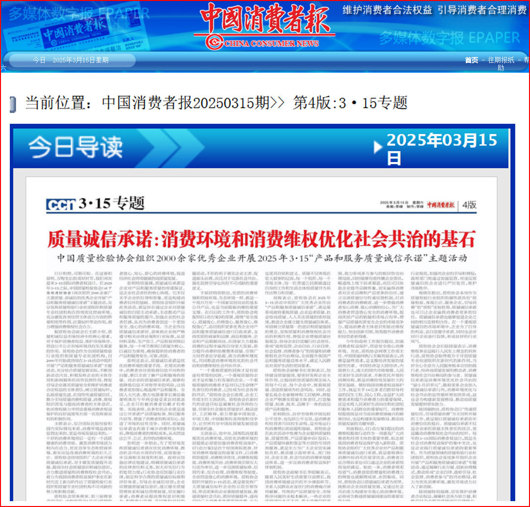 《中國消費(fèi)者報(bào)》(2025年3月15日刊)發(fā)布:質(zhì)量誠信承諾:消費(fèi)環(huán)境和消費(fèi)維權(quán)優(yōu)化社會(huì)共治的基石——中國質(zhì)量檢驗(yàn)協(xié)會(huì)組織2000余家優(yōu)秀企業(yè)開展2025年3·15“產(chǎn)品和服務(wù)質(zhì)量誠信承諾”主題活動(dòng)