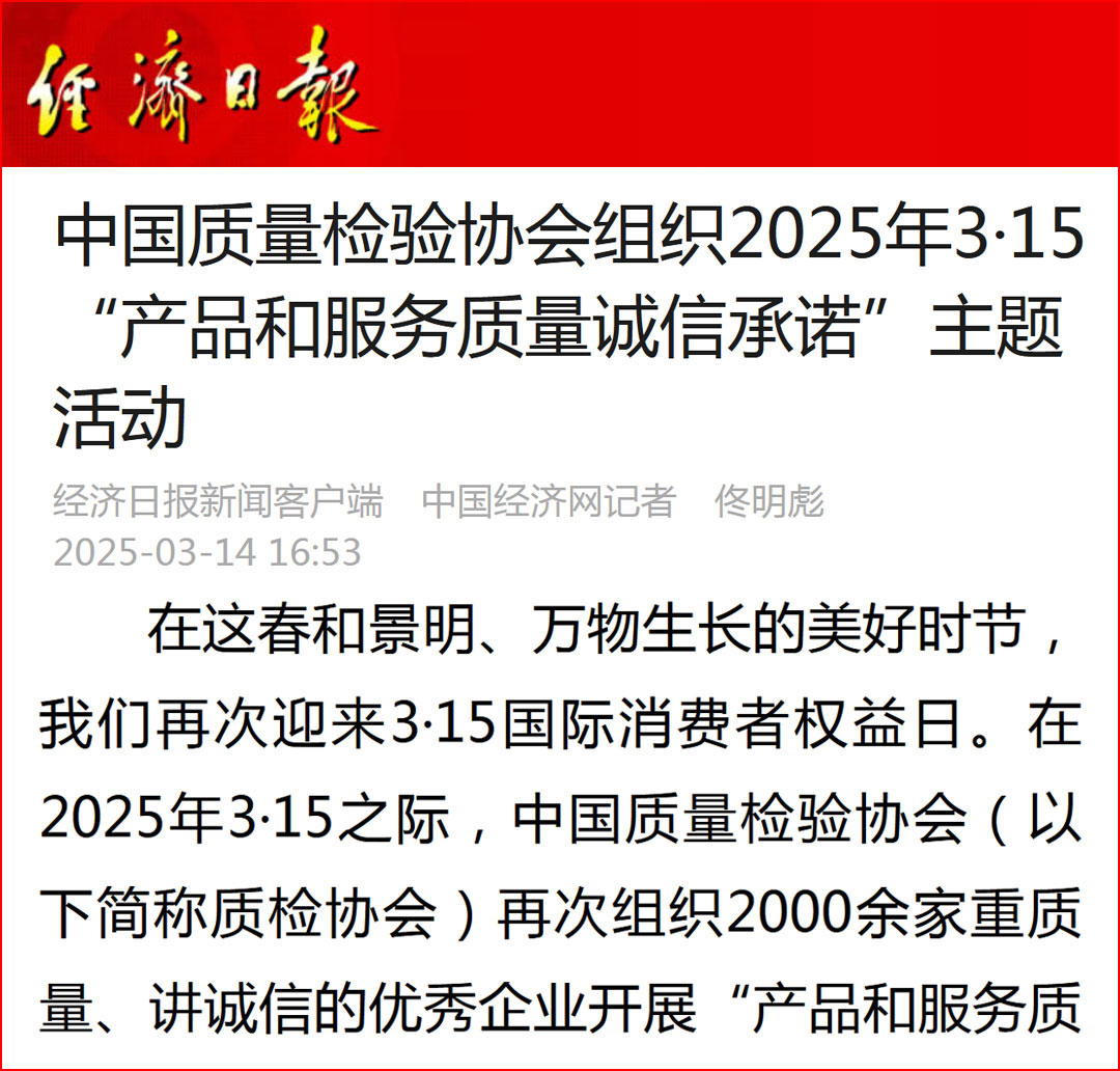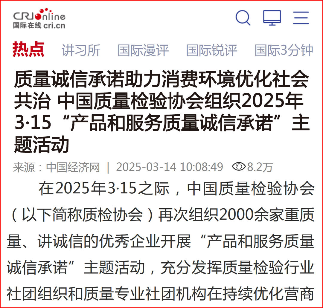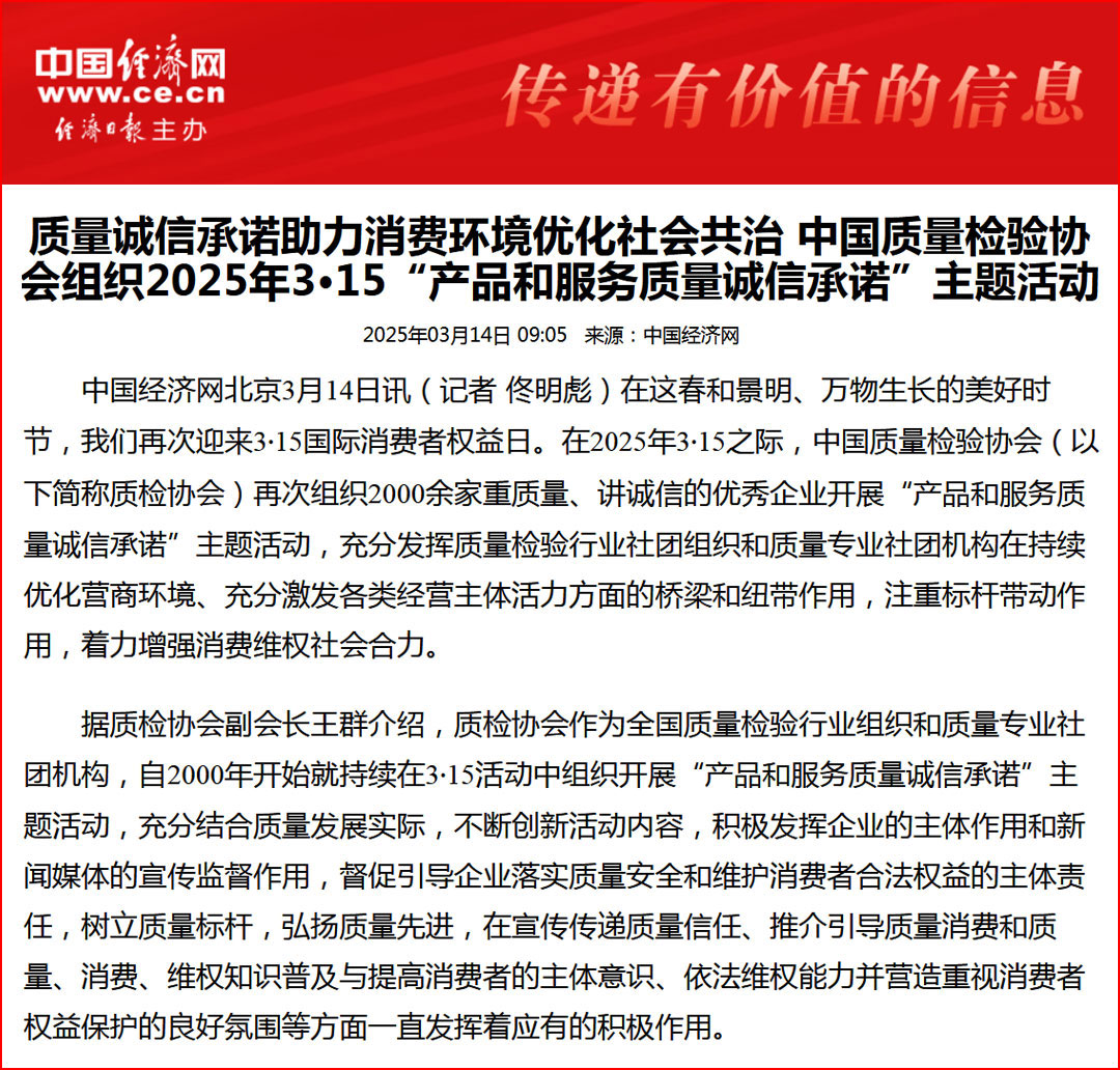 中國經(jīng)濟(jì)網(wǎng)“質(zhì)量經(jīng)濟(jì)頻道”發(fā)布:質(zhì)量誠信承諾:消費(fèi)環(huán)境和消費(fèi)維權(quán)優(yōu)化社會(huì)共治的基石——中國質(zhì)量檢驗(yàn)協(xié)會(huì)組織2000余家優(yōu)秀企業(yè)開展2025年3·15“產(chǎn)品和服務(wù)質(zhì)量誠信承諾”主題活動(dòng)