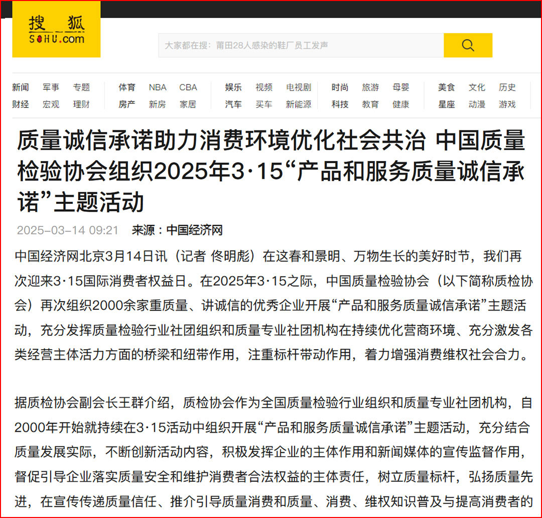 搜狐網(wǎng)報(bào)道:質(zhì)量誠信承諾助力消費(fèi)環(huán)境優(yōu)化社會(huì)共治——中國質(zhì)量檢驗(yàn)協(xié)會(huì)組織2025年3·15“產(chǎn)品和服務(wù)質(zhì)量誠信承諾”主題活動(dòng)