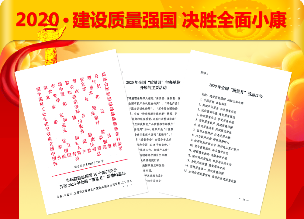 2020年9月,市場監(jiān)管總局聯(lián)合中共中央宣傳部、國家發(fā)展改革委、科技部、工業(yè)和信息化部、公安部、生態(tài)環(huán)境部、住房和城鄉(xiāng)建設(shè)部、交通運輸部、農(nóng)業(yè)農(nóng)村部、商務(wù)部、文化和旅游部、國家衛(wèi)生健康委、人民銀行、國務(wù)院國資委、海關(guān)總署等16個部門,共同開展以“建設(shè)質(zhì)量強國 決勝全面小康”為主題的2020年全國“質(zhì)量月”活動。